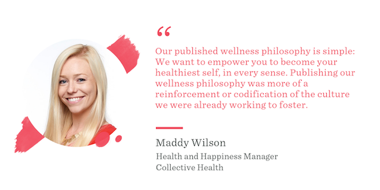Collective Heath’s mission is to enable its members to work well, so of course that ambition applies to its own employees too. According to Maddy Wilson, the company’s Health and Happiness Manager, wellbeing has always been part of the culture at Collective Health. As the team expanded, the People Ops team defined a wellness philosophy to reflect the evolving needs of its employees, which set the tone for the guide and all its related programs, benefits, career development, and culture.