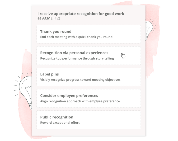 When you take action based on employee feedback, meaningful and positive changes follow that can directly impact your organization's success. Whether trying to increase engagement or improve retention, the action framework can empower your managers to take action easily and quickly to build momentum and improve your workplace.