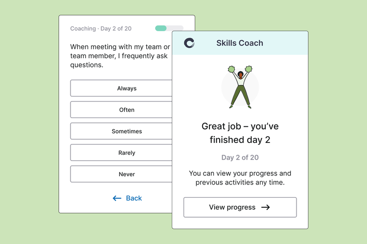 - Accommodates busy schedules. Managers are busy and don’t need more added to their plates. That’s why each Skills Coach program only consists of about 20 two-minute exercises. Not only that, but these exercises are also delivered to managers daily on Slack – somewhere they’re already spending time.