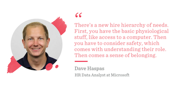 During the discussion, Dave brought up an excellent point about how a successful onboarding process should meet the new hire’s hierarchy of needs - from making sure they have the basics covered to cultivating a sense of belonging within the organization. Using people analytics data can help pinpoint what these needs might be, and whether or not they’re being met during the onboarding experience.