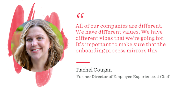 “All of our companies are different, with different values and vibes they’re going for. It’s important to make sure that the onboarding process mirrors this. For instance, Starbucks is lovely. But Chef doesn’t want the Starbucks process. They want to ensure new hires are getting something uniquely Chef when they're being onboarded.”