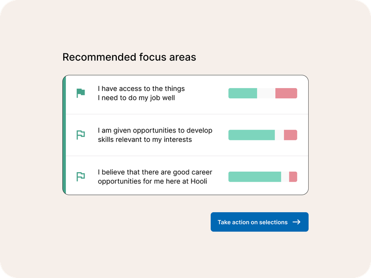 Use employee feedback tools like Culture Amp to calculate a real-time impact analysis to help teams find focus. Culture Amp even has an embedded focus agent at every reporting level in the organization that provides clear guidance on potential opportunities for focus. -