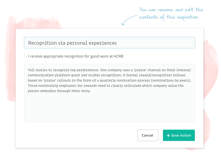 Not only can you edit and customize these inspirations to fit your team’s needs, you can also add your ideas to the engine contributing to Collective Intelligence and organizational success globally.