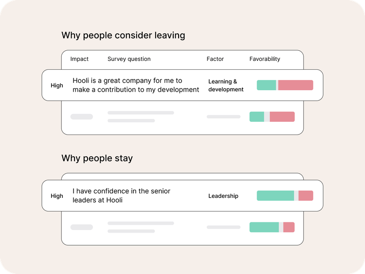 The Commitment Motivators functionality lets you learn which aspects of the employee experience motivate different groups to either stay or leave. Use it to precisely target your retention initiatives for maximum impact.