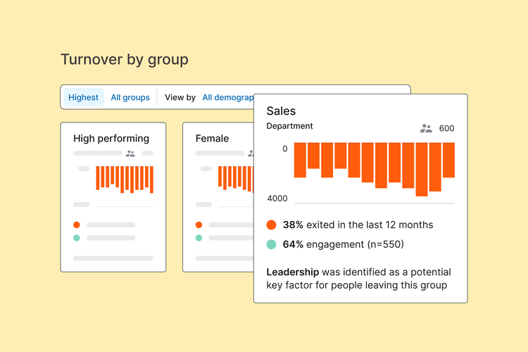 For example, one HR team used Group Turnover Analysis to present their Chief Sales Officer (CSO) with retention and turnover insights for high-performing Account Executives in all locations. They were able to show the CSO exactly where they risk losing the most high-performing salespeople and why. HR then strategically partnered with this key leader to help drive the action necessary to mitigate future turnover in this area.