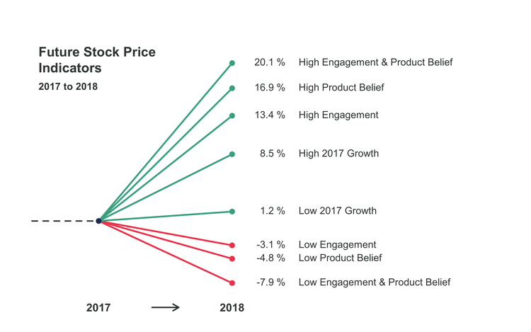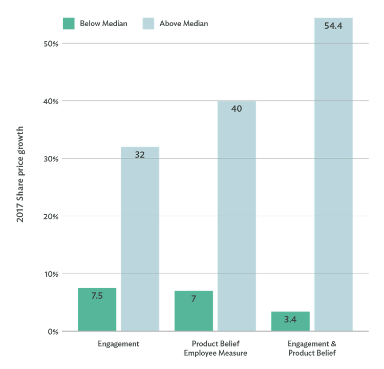 Importantly, with more than 50% of the companies listed in the US, the higher-performing group (Engagement and Product Belief) gained over twice as much as the Dow Jones Index (~25% in 2017).